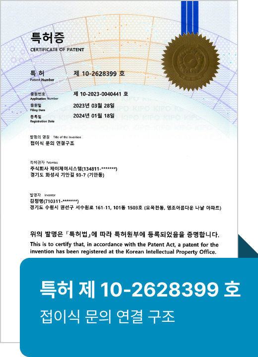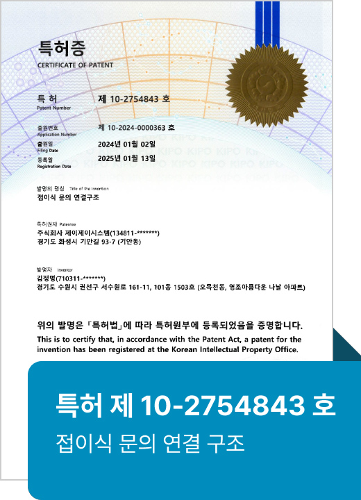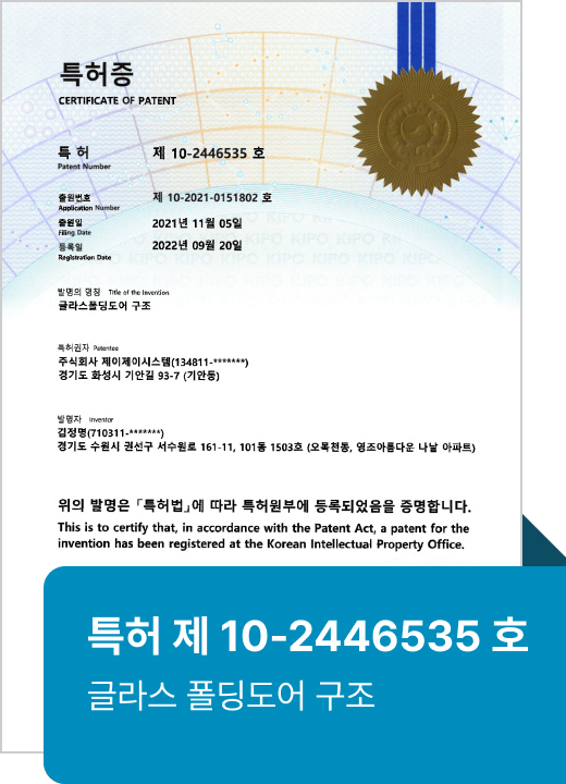 프레임리스 글라스폴딩도어 전용 기술특허 3건