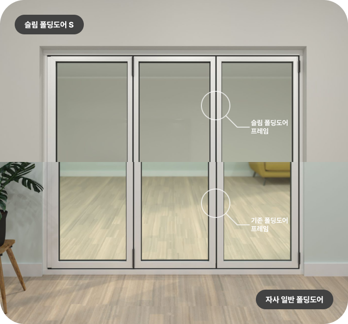 폴딩도어 S는 프레임이 혁신적으로 슬림화되어 개방감과 시인성을 크게 향상시킨 제품입니다.