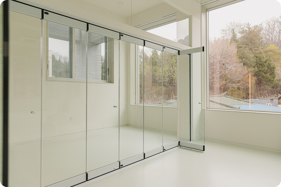 유일무이한 특허를 받은 글라스폴딩도어는 업계 최초로 독립 구동 방식을 채택하여 원하는 부분만 한짝씩 접어 사용할 수 있습니다.