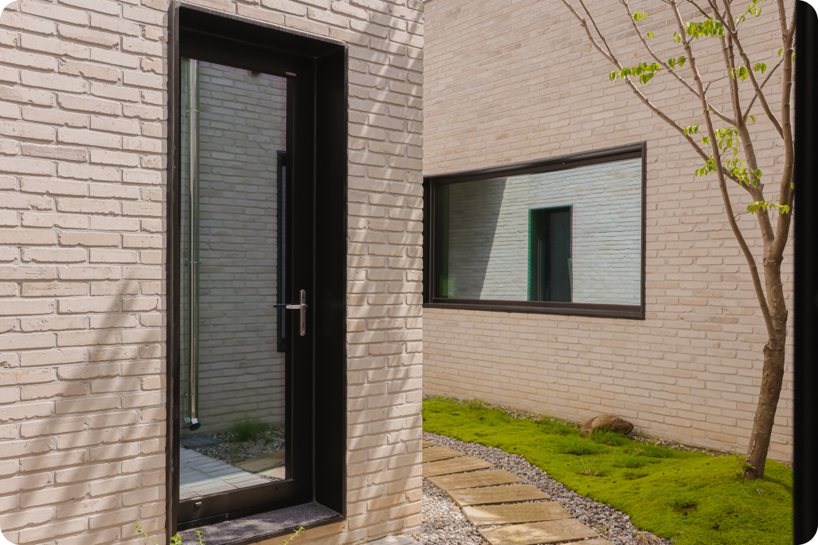 뛰어난 기밀성과 단열 성능을 갖춘 독일식 AL 시스템도어로, 미니멀한 디자인과 유리 입면이 개방감을 제공합니다.