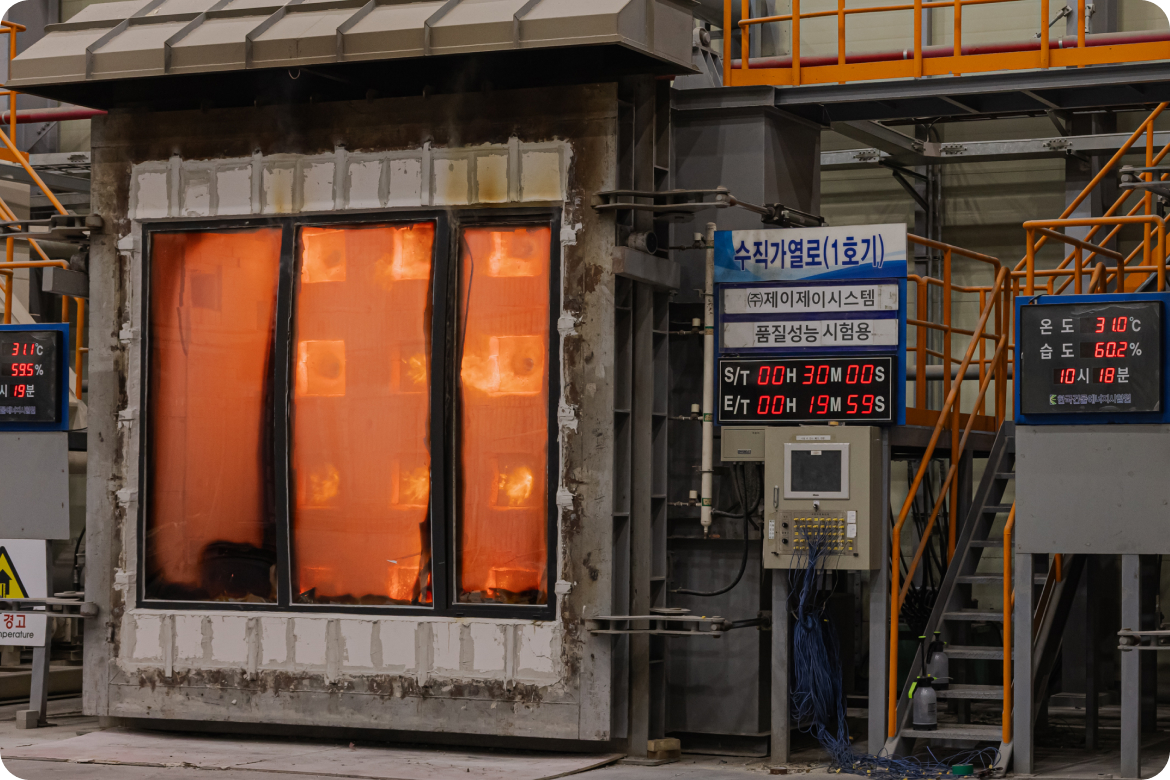 <한국건물에너지시험원>에서 검증을 받았으며, 한국산업표준 KS F 2845(유리구획부분의 내화시험방법) 기준에 따라 비차열 20분 이상의 성능을 내·외측 모두 통과했습니다. - 제품 특징4면 수평 밀착 슬라이딩 PS와 틸트 & 턴 창 TT에 내화성 높은 화이버글라스 소재를 적용하여