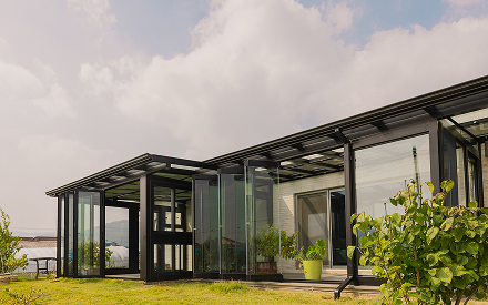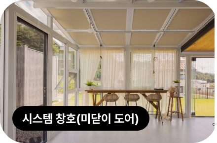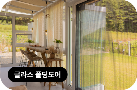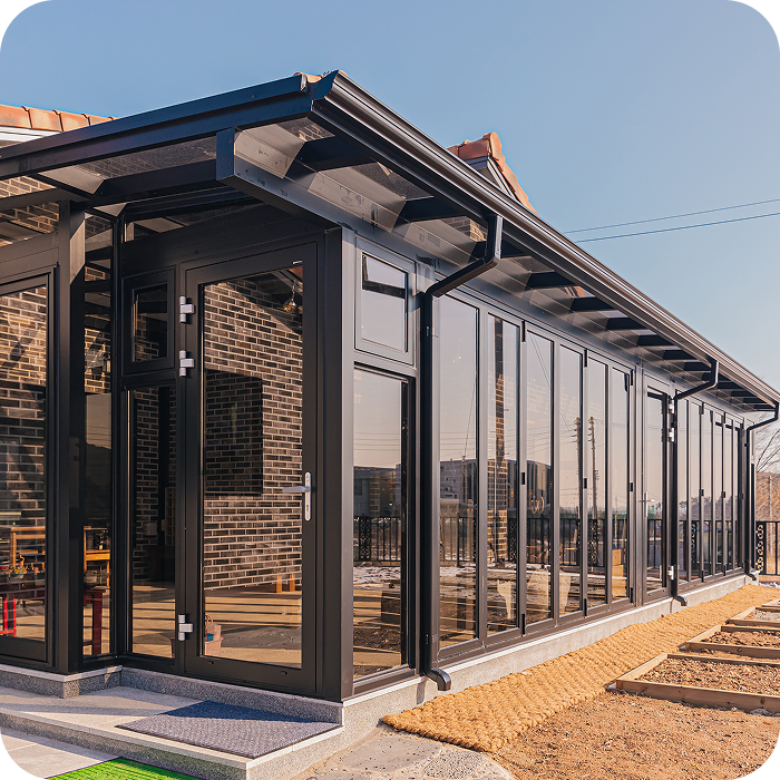 고강도 알루미늄만을 엄선하여 불소 도장으로 썬룸 전용 바를 비롯해 시스템창호, 시스템도어, 알루미늄 폴딩도어, 글라스폴딩도어로 마감하여