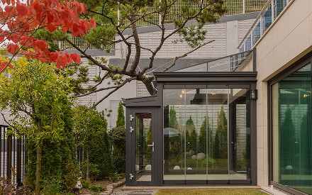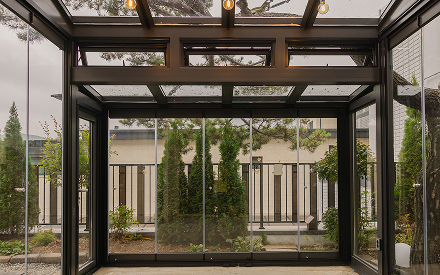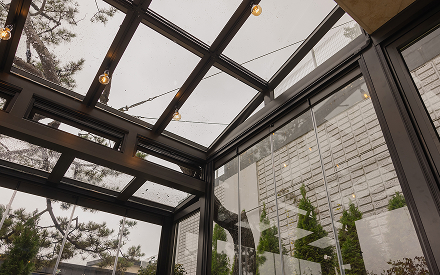 다크그레이 썬룸은 정원 소나무의 존재감을 살리기 위해 이중 지붕을 적용하여