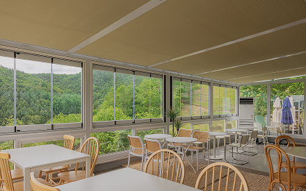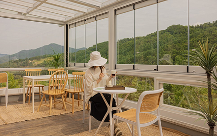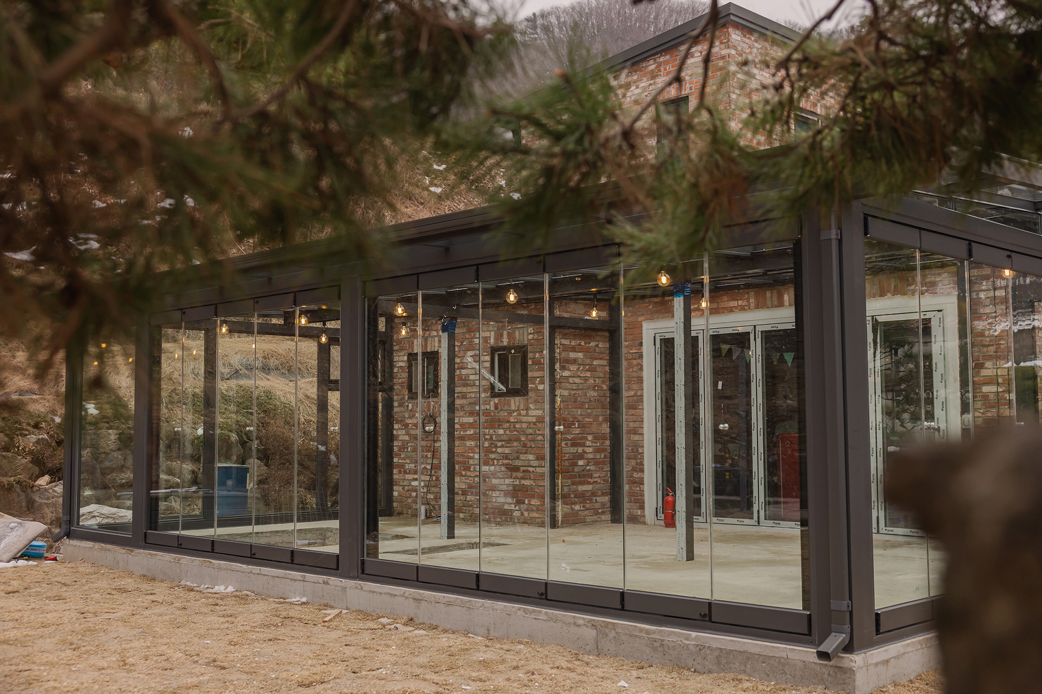 한국의 스위스, 태백의 마운틴 뷰 속에 자리한 목장 카페의 화이트 썬룸은 건물을 중심으로 양쪽에 대칭을 이루는 글라스폴딩도어 G,