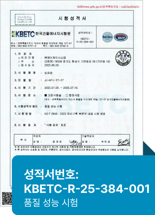 · 한국산업표준 KS F 2845(유리구획부분의 내화시험방법)가 규정하는 방화창 기준인 비차열 20분 이상 성능을