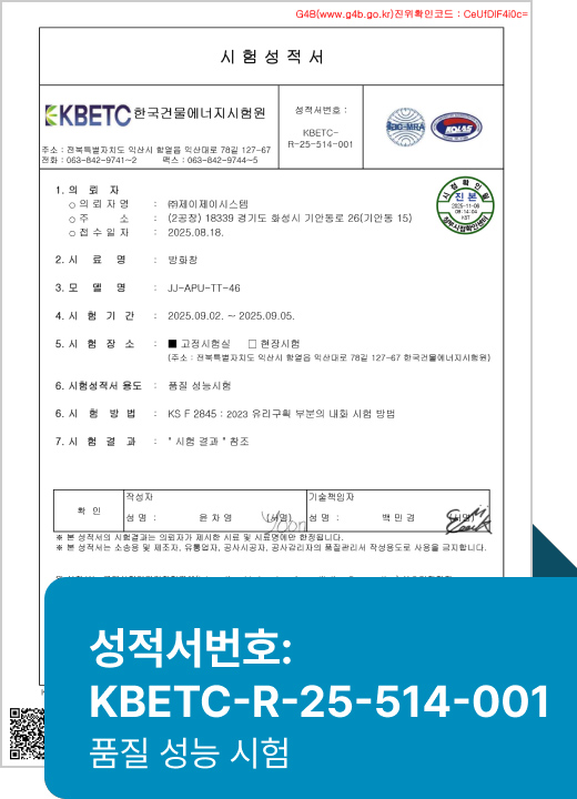 고내화성 소재인 화이버글라스와 방화유리로 제작된 바튼 방화창은 한국산업표준 KS F 2845(유리구획부분의 내화시험방법) 기준에 따라 최대 사이즈(3,000mmX2,400mm)로 비차열 20분 이상의 성능을 내·외측 모두 통과한 믿을 수 있는 제품입니다.